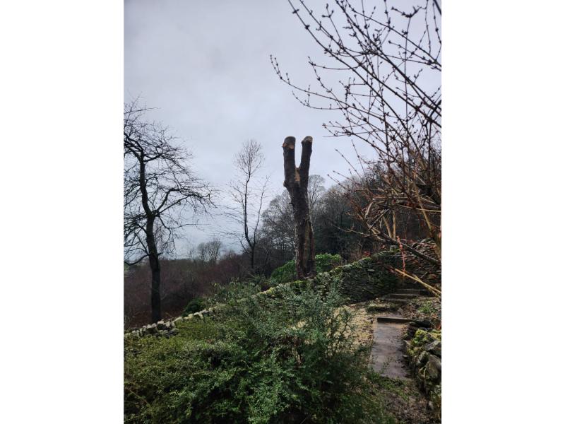 Recently our team at Marsh Tree Care Ltd. took on a particularly challenging sycamore pollard in the heart of Hathersage. The tree had suffered historic fire damage, leaving a significant wound on the main stem. After a thorough assessment, it was clear that a full pollard was the safest and most responsible way to manage the tree and prevent future failure.